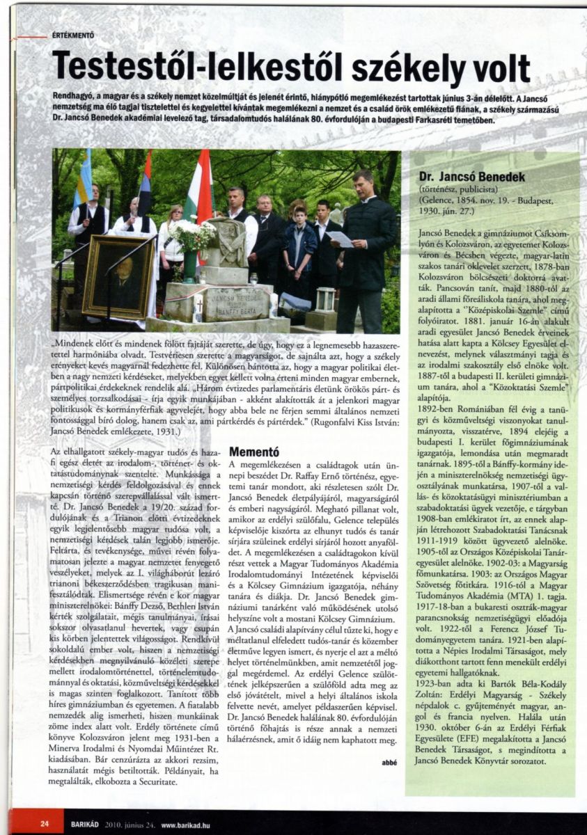 2010. június 3-án a Jancsó Alapítvány szervezésében a budapesti Farkasréti Temetőben emlékeztek Dr. Jancsó Benedek történész, akadémiai tag halálának 80. évfordulójára.